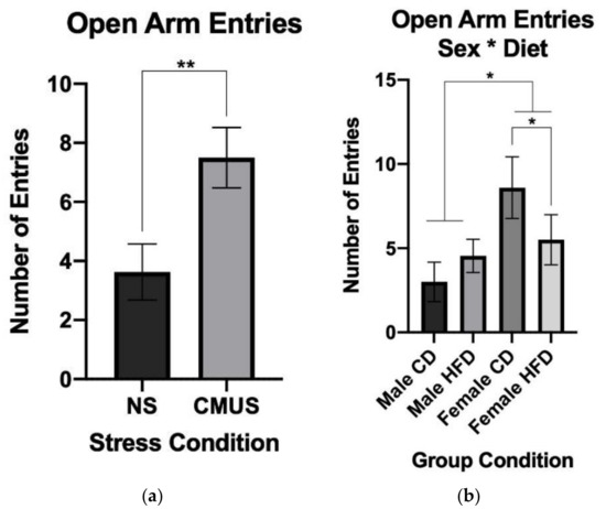 (a) Open arm entries in the EZM. Mice in the CMUS condition entered the open arm significantly more than those in the NS condition (** p < 0.01). (b) Open arm entries in the EZM (sex*diet). Female mice made significantly more entries into the open arm of the EZM than male mice. Female mice given a HFD made significantly fewer open arm entries compared to female mice in the CD condition (* p < 0.05). Females on a CD made a higher number of open arm entries compared to CD males in both NS (p < 0.05) and CMUS conditions (p = 0.066).