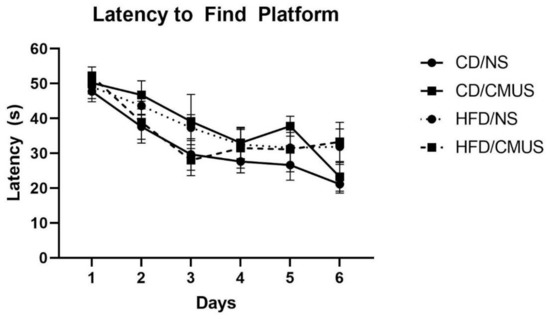 Although mice were able to learn the task over the training days, as seen by a significant effect of day, F(5, 145) = 15.159, p < 0.001, and partial η2 = 0.343 (Figure 7), there were no between-subject effects seen. However, a trending effect of diet*stress was seen, F(1, 29) = 3.058, p = 0.091, and partial η2 = 0.095. For mice receiving no stress, HFD mice took longer to find the platform compared to those on a CD (p = 0.095). In those mice that were given a CD, mice given CMUS took longer to find the platform than those in the NS condition (p = 0.059).
