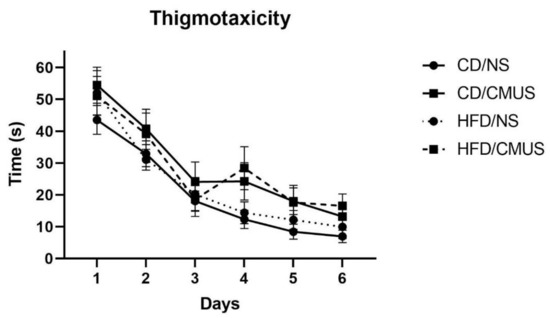 In the present study, we assessed chronic mild unpredictable stress (CMUS) and HFD effects when given to mice during 4–8 weeks; this was done in both male and female mice, given that sex differences have been observed in mice undergoing diet-induced obesity [45]. Behavioral tests were run assessing anxiety, spatial memory, and noncognitive activities of daily living (ADLs) in order to investigate what effects HFD and CMUS would have on behavior in the early adult mouse after sustaining these factors during the crucial developmental time of adolescence. The results showed that stressed mice exhibited behavioral disinhibition, impaired spatial memory, and built better nests than non-stressed (NS) mice. Mice that were given a HFD had impaired nesting scores and, at several times, there was an interaction between the diet and stress.