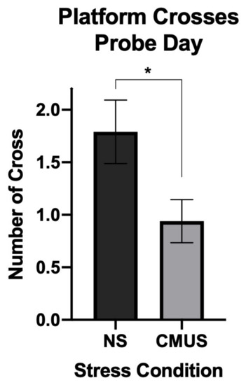 Number of platform crosses on the 24 h Probe Day (Day 7). Mice experiencing CMUS made significantly fewer crosses over the submerged platform as compared to mice experiencing no stress (NS) (* p < 0.05).
