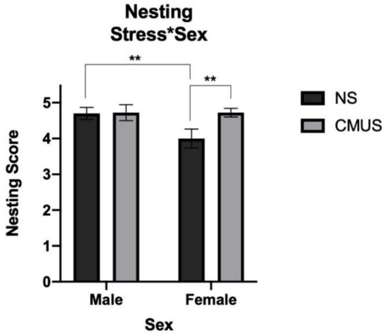 Nesting scores (stress*sex). Female mice undergoing CMUS made significantly better nests than females in the NS condition. Male mice under NS made significantly better nests than females in the NS condition (** p < 0.01).