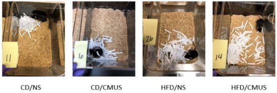 Representative nests built by mice in the experimental conditions. Mice given HFD built significantly worse nests than those given CD (p < 0.05). CMUS mice built significantly better nests than those under NS (p < 0.05). 11—Control Diet, No Stress; 6—Control Diet, Chronic Mild Unpredictable Stress; 26—High Fat Diet, No Stress; 14—High Fat Diet, Chronic Mild Unpredictable Stress.