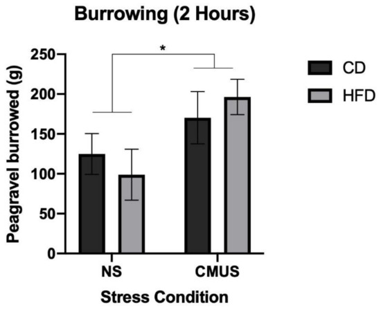 A 2 × 2 × 2 ANOVA was run on the amount of pea-gravel burrowed after 2 h. There was a significant effect of stress, F(1, 29) = 5.451, p < 0.05, and partial η2 = 0.158. Mice that underwent CMUS burrowed significantly more pea-gravel when compared to those experiencing NS (p < 0.05). (Figure 14) Additionally, there was a significant diet*stress*sex interaction, F(1, 29) = 14.093, p = 0.001, and partial η2 = 0.327. In the NS condition, male mice receiving a HFD burrowed significantly less than those on a CD (p < 0.01) and female mice receiving a HFD burrowed significantly more than those on a CD diet (p < 0.05). In both dietary conditions, CMUS led to an increase in burrowing, which was further moderated by sex: female mice on a CD experiencing CMUS burrowed more than those NS females on CD (p = 0.002) and male mice on a HFD experiencing CMUS burrowed more than those NS males on HFD (p = 0.004).