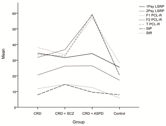 As shown in Table 3, the ANOVA analysis showed significant differences both for the primary and secondary LSRP scores, and Tukey tests showed lower control group scores compared to the CRD + SCZ (p < 0.001), CRD + APD (p = 0.004), and CRD (p < 0.001) groups. The secondary scores were significantly lower in the CRD and control groups compared with the CRD + SCZ (p = 0.031 and p < 0.001) and CRD + APD (p = 0.038 and p < 0.001) groups. Again, ANOVA analyses showed significant differences in PCL-R scores for all the subscales, which were lower for the control group social deviation factor (p = 0.004 for CRD and p < 0.001 for CRD + SCZ and CRD + APD) and for CRD and CRD + SCZ compared to CRD + APD (p < 0.001). Similarly, the control scores were significantly lower than those of the CRD + SCZ, CRD + APD, and CRD groups (p < 0.001) for the interpersonal/affective factor; CRD and CRD + SCZ were lower than CRD + APD (p < 0.001), and CRD was lower than CRD + SCZ (p = 0.027). The overall score was significantly lower in the controls compared to the other groups (p < 0.001) and in the CRD and CRD + SCZ groups compared to the CRD + APD group (p < 0.001). Together, these results suggest the following ascending psychopathy pattern: control < CRD + SCZ ≈ CRD < CRD + APD, although CRD + SCZ scores were significantly higher than CRD in the secondary LSRP factor and the PCL-R interpersonal/affective factor. One-way ANOVA also revealed significant differences in the SPSRQ results, with post-hoc tests showing higher scores for punishment sensitivity in the CRD + SCZ group compared to the CRD (p = 0.005), CRD + APD (p = 0.036), and control (p = 0.001) groups.