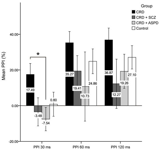 Prepulse inhibition (PPI) of the acoustic startle reflex is widely used to measure sensorimotor activation and provide information on the processing capacity and function of patients [,]. PPI measures the reflex amplitude difference elicited by a “pulsed” sound stimulus subsequent to a less intense “prepulse”. PPI can be modulated by the interval (normally 30–300 ms) separating the two pulses, although maximum inhibition usually occurs at 100–120 ms [,]. Regarding intervals, shorter ones such as 30 ms respond to pre-attentive and automatic perceptual processing, whereas longer intervals such as 120 ms are partially automatic, meaning that they can proceed automatically, but also of controlled attentional modulation []. PPI is a good neurobiological marker between different species because it is hereditary and does not become habituated or eliminated over repeated tests [,,,,]. Moreover, PPI is reduced in patients with schizophrenia, making it a good endophenotype for this pathology [,,,,,], and lower PPI is also associated with antisocial characteristics [,]; a recent study used PPI to discriminate between patients with APD alone or APD with psychopathy []. We also previously showed that patients with CRD + SCZ or CRD + APD presented PPI deficits compared to patients with CRD without a DP [].