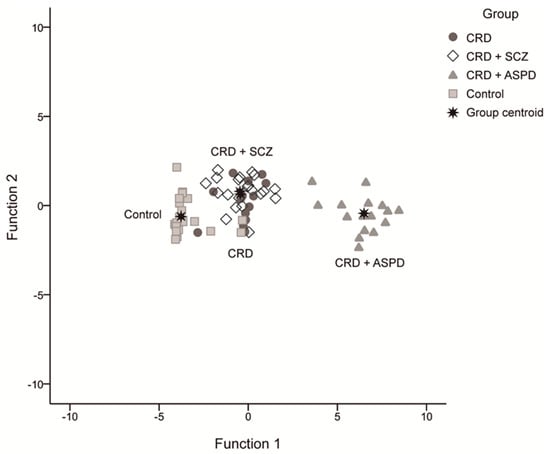 Scatter diagram for the discriminating functions. CRD: cocaine-related disorder; SCZ: schizophrenia; APD: antisocial personality disorder.