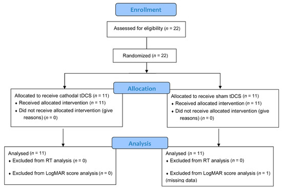 All data were analyzed using SPSS 26 software (IBM Corp., Armonk, NY, USA). Shapiro–Wilk and Levene’s test assessed the normality of the data distribution and homogeneity of variances, respectively. In instances of normality violation (Shapiro–Wilk test: p ≤ 0.05), the data are logarithmically transformed. The LogMAR scores were analyzed using a three-way (2 × 2 × 2) mixed analysis of variance (ANOVA) with a between-subject factor “stimulation” (cathodal tDCS and sham) and within-subject factors “time” (before and after stimulation) and “eye” (right and left). One patient from the sham group had missing visual acuity data; therefore, we only analyzed LogMAR scores from 11 patients in the tDCS group and 10 patients in the sham group. For the numerosity discrimination task, we calculated the average RTs before and after stimulation. Discarded RT (excluded from the analysis) are those beyond 2 standard deviations (SDs) away from the mean (outliers) and those from incorrect trials. To determine the accuracy rate (AR%), we divided the number of correct trials from the total number of trials and multiplied by 100. The RTs and ARs were analyzed using a two-way (2 × 2) mixed ANOVA with a between-subject factor “stimulation” (cathodal tDCS and sham) and a within-subject factor “time” (before and after stimulation). Effect sizes were reported as partial eta squared (ηρ2) values (small: 0.01, moderate: 0.06 and large: >0.13). If the ANOVA yielded significant results, we explored it with a Bonferroni corrected post-hoc t-test. In all statistical analyses, we set a threshold significance level at a p-value of ≤0.05. Unless otherwise stated, all reported values are mean ± SD.