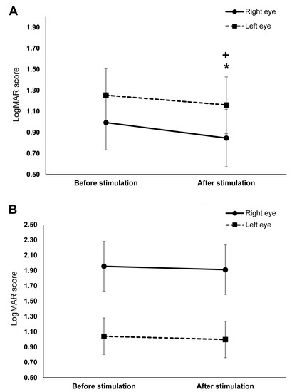 The effects of cathodal transcranial direct current stimulation (tDCS) and sham stimulation on visual acuity. The y-axis displays the mean LogMAR scores. The x-axis displays the time points of the LogMAR score measurement. (A) Visual acuity before and after cathodal tDCS stimulation. The right (straight line) and left (dashed line) eye’s LogMAR scores significantly decreased after stimulation. (B) Visual acuity before and after sham stimulation. There were no significant changes in the LogMAR scores of both eyes after sham stimulation. + = significant differences between the pre- and post-stimulation LogMAR score of the right eye (p ≤ 0.05), * = significant differences between the pre- and post-stimulation LogMAR score of the left eye (p ≤ 0.05). Presented data are mean values ± standard error of the mean (SEM).