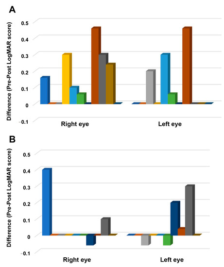 The time and stimulation interaction was also significant (F (1,19) = 8.92, p = 0.008, ηρ2 = 0.319). Bonferroni corrected post hoc comparisons showed that the overall score in the tDCS group (before stimulation: 1.13 ± 0.94, after stimulation: 1.00 ± 0.95) significantly decreased after stimulation (p ≤ 0.001), whereas the decrease in the overall score in the sham group (before stimulation: 1.49 ± 0.98, after stimulation: 1.45 ± 0.99) was not significant (p = 0.549). The three-way interactions of stimulation, time, and eye was not significant (Table 2). Planned exploratory post hoc comparisons revealed that this result was mainly driven by the absence of significant differences in the sham group’s pre- and post-stimulation scores of the right (before stimulation: 1.96 ± 0.33, after stimulation: 1.91 ± 0.32; p = 0.794) and left eye (before stimulation: 1.04 ± 0.24, after stimulation: 1.00 ± 0.24; p = 0.542) (Figure 3B); and second, the absence of significant differences in the left eye’s pre-stimulation (tDCS: 1.25 ± 0.86, sham: 1.04 ± 0.75; p = 0.835) and post-stimulation scores (tDCS: 1.16 ± 0.90, sham: 1.00 ± 0.75; p = 0.909) between stimulation conditions. However, post hoc comparisons in the tDCS group revealed a significant decrease in the right (before stimulation: 0.99 ± 0.25, after stimulation: 0.85 ± 0.27; p = 0.001) and left eye’s scores (before stimulation: 1.25 ± 0.26, after stimulation: 1.16 ± 0.27; p = 0.020) (Figure 3A). The right eye’s post-stimulation scores also differed significantly between stimulation conditions, with the score in the tDCS group (0.85 ± 0.88) being lower than in the sham group (1.91 ± 1.03) (p = 0.011). Figure 4 shows the difference between the pre- and post-stimulation LogMAR scores of individual patients in the tDCS and sham group.