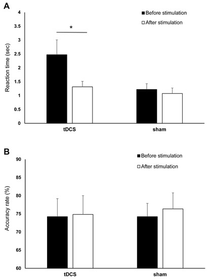 For the RTs, the final dataset included 976 trials (73.94% of 1320 trials). RTs from incorrect trials (331) and outliers (13) accounted for 25.08% and 0.98% of the full dataset, respectively, and were excluded in the final analysis. The ANOVA for the log-transformed RTs yielded a significant main effect of time (F (1,20) = 22.02, p ≤ 0.001, ηρ2 = 0.524) as indicated by the shorter post-stimulation overall RT (before stimulation: 1.85 ± 1.03 s, after stimulation: 1.19 ± 0.05 s). The main effect of stimulation was not significant (F (1,20) = 2.665, p = 0.118, ηρ2 = 0.118), indicating comparable overall RT between tDCS (1.89 ± 1.33 s) and sham (1.15 ± 1.33 s) group. However, the effect of time and stimulation interaction was significant (F (1,20) = 5.85, p = 0.025, ηρ2 = 0.226). Bonferroni corrected post hoc comparisons showed that RTs significantly decreased in the tDCS group (before stimulation: 2.47 ± 1.77 s, after stimulation: 1.32 ± 0.65 s) (p ≤ 0.001). However, the RTs were comparable before (1.22 ± 0.68 s) and after (1.07 ± 0.65 s) sham stimulation (p = 0.124) (Figure 5A). Figure 6 shows the difference between the pre- and post-stimulation RT of individual patients in the tDCS and sham group. The ANOVA for the AR yielded no significant results (Table 2, Figure 5B).