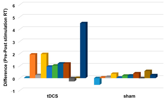 The difference between pre- and post-stimulation reaction time (RT). The y-axis displays the difference between the before and after stimulation reaction time (s). The x-axis indicates the groups (tDCS and sham). Each column represents the individual participant’s reaction time difference. A positive and negative score indicates a shorter and longer reaction time after stimulation, respectively.