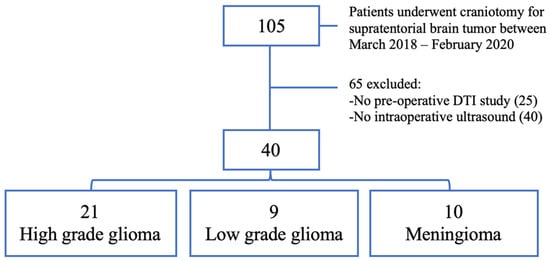 One hundred and five patients underwent surgery during the study period; 40 patients were excluded due to the lack of an intraoperative elastographic study, while 25 were excluded due to the absence of a pre-surgical DTI study. Therefore, 40 patients met the selection criteria and were available for analysis.