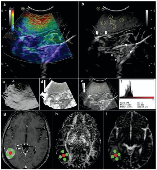- Cepeda, S.; Barrena, C.; Arrese, I.; Fernandez-Pérez, G.; Sarabia, R. Intraoperative ultrasonographic elastography: A semi-quantitative analysis of brain tumor elasticity patterns and peritumoral region. World Neurosurg. 2020, 135, e258–e270. [Google Scholar] [CrossRef] [PubMed]
