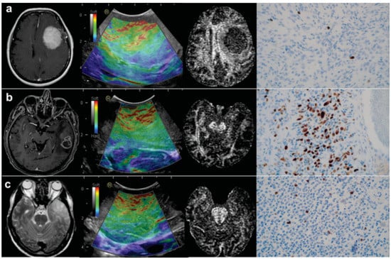 Illustrative cases of histopathological groups: (a) 75-year-old woman with a left frontal meningioma; (b) 56-year-old man with a left temporal low-grade glioma; and (c) 54-year-old man with a left temporal glioblastoma. From left to right: Axial T1-weighted post contrast slices for glioblastoma and meningioma and T2-weighted for low-grade glioma; ultrasound elastography images; fractional anisotropy maps; and immunohistochemical staining of Ki-67 at × 40 magnification.