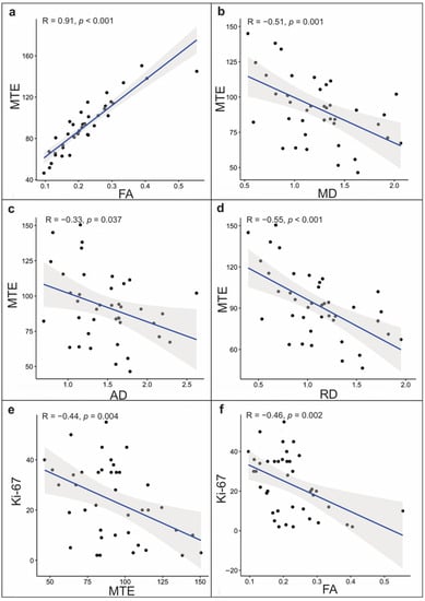 Scatterplots of a correlation analysis of the whole tumor volume for the mean tissue elasticity (MTE) and (a) fractional anisotropy, (b) mean diffusivity, (c) axial diffusivity, and (d) radial diffusivity. Significant correlations were also found between Ki-67, (e) MTE, and (f) fractional anisotropy.