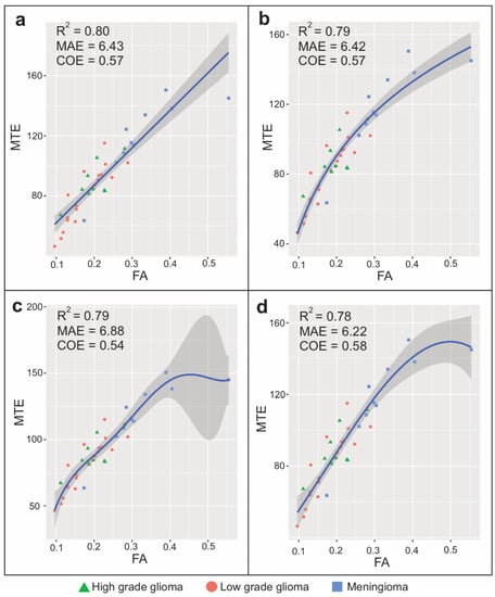 After establishing the correlations between the tumor elasticity and DTI-derived metrics, a predictive model was developed, using the MTE as the dependent variable and the diffusion coefficients as predictors. The collinearity diagnosis between predictors was performed using the variance inflation factors measure (VIF) and the Farrar–Glauber test. Models were based on linear, logarithmic, quadratic polynomial, and cubic spline regression. Assumptions of homogeneity of variance, linearity, and the distribution of residuals were verified for each model. For model validation, the study sample was divided in a randomized manner, applying an 80/20 ratio to fit the models; the remaining 20% was used for validation. The estimators used for the assessment of the models were as follows: the determination coefficient (R squared); the absolute fit of the model represented by the mean absolute error (MAE); and efficiency estimators, such as the index of agreement (IOA) [] and coefficient of efficiency (COE) [].