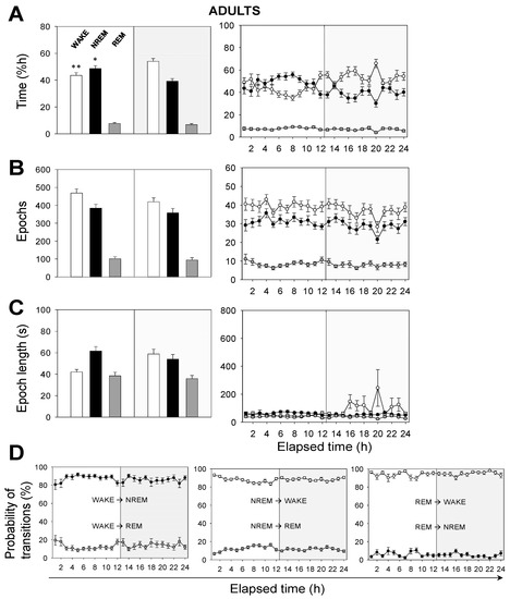 Figure 2B,C), the number of epochs for each behavioral state, especially for wakefulness, decreased during the 12 h-dark phase. Wakefulness epochs were longer at nighttime than they were at daytime, while those of NREM and REM sleep remained steady. In adults, the number of epochs for each behavioral state tended to reduce during the recording session, showing slightly higher values at daytime than those at nighttime (