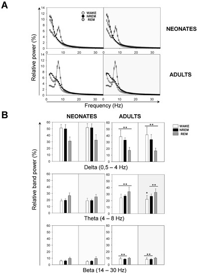 Figure 4B). There were no remarkable differences in the relative band power between both light phases for any frequency band within either age group. Within the delta (δ) frequency band, neonates were characterized by a greater relative power than adults for each behavioral state. Wakefulness showed the greatest relative power, followed closely by that of NREM sleep. Within the theta (θ) frequency band, we found the opposite pattern: adults were characterized by a higher relative power than neonates for each behavioral state. REM sleep showed the greatest relative power. Within α (and β, during wakefulness and NREM sleep) frequency bands, we concluded the same as for the θ frequency band upon the neonate–adult pattern, but with overall smaller relative band powers for each behavioral state (