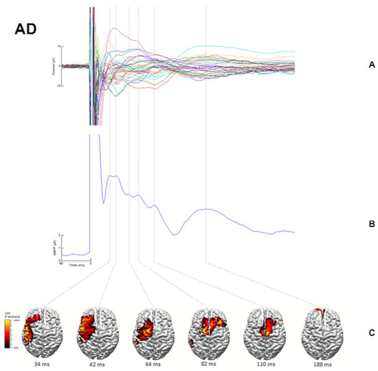Alzheimer’s disease (AD) patients. (A) Averaged TMS-evoked potentials recorded at all electrodes, superimposed in a butterfly diagram. (B) Global activation induced by TMS as evaluated by the global mean field power (GMFP). (C) Source localization of the activity occurring during each peak in the GMFP calculated using standardized, low-resolution brain electromagnetic tomography (sLORETA) and plotted on the cortical surface. At each time point, the results were auto-scaled and thresholded at 80% to highlight maximum current sources. Reproduced with permission from Ferreri et al., 2016 [30].