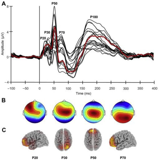 TMS–EEG results. (A) Butterfly plot of the grand-averaged TMS-evoked potentials (TEP) from all the electrodes showing the main components elicited by left dorsolateral prefrontal cortex stimulation. The signal from the target site of stimulation (electrode F3) is depicted by the red line. (B) Topographic distribution. (C) sLORETA source localization for each TEP component before 100 ms. (For interpretation of the references to color in this figure legend, the reader is referred to the Web version of this article). Reproduced with permission from Bagattini et al., 2019 [34].