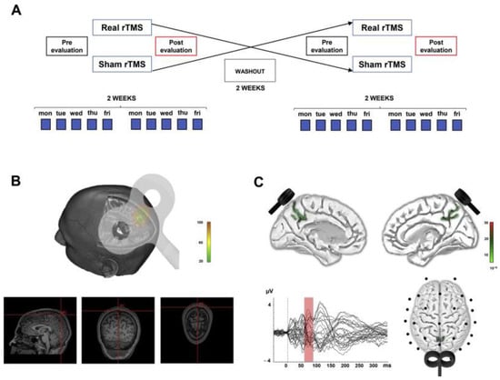 Experimental design and source analysis reconstruction. (A) AD patients (n = 14) were randomly assigned to either a first neuronavigated rTMS or control stimulation (sham) arm. rTMS/sham was delivered daily in a 10-session course, Monday to Friday, for a total duration of two weeks. A two-week washout interval was then applied, following which patients were crossed over to the alternative study arm for two additional weeks. The order of assignment to either study arm was counterbalanced across patients. (B) rTMS was applied over the PC at 20 Hz (1600 stimuli per day), using a neuronavigation system to ensure that the same spot was constantly stimulated across sessions. (C) Source analysis of TMS-evoked EEG activity revealed a bilateral activation of the PC, as reconstructed at the peak fit of cortical response between 60 and 90 ms from single-pulse TMS over PC. Reproduced with permission from Koch et al., 2018 [33].