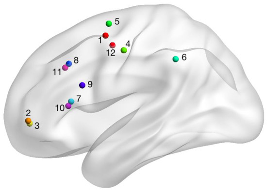Plotted fMRI-navigated stimulation sites for all study participants on a model of a standard left hemisphere. Numbers correspond to the participant number (Table 1).