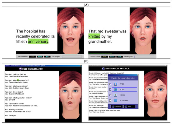 Sample screenshots showing the “virtual therapist” and examples of sentence and script stimuli in (A) AphasiaScripts® and (B) ORLA®. Words are highlighted in green as the virtual therapist reads the sentences aloud by herself and then in unison with the participant. When the participant reads the sentences aloud in unison and independently, the green highlighting of the words and the virtual therapist’s mouth movements provide cues that help with the accuracy and rate of production of the words and sentences. In AphasiaScripts®, these cues can be removed one at a time during the conversation practice.