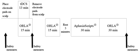 Schematic of a daily treatment session showing the sequence and length of time of each of the behavioral treatments: Oral Reading for Language in Aphasia (ORLA®) and AphasiaScripts®. The tDCS was always applied with ORLA®. The schematic also shows when safety measures were collected.