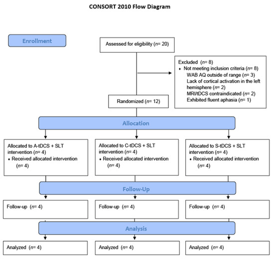 CONSORT 2010 Flow Diagram. Note. A-tDCS = anodal, C-tDCS = cathodal, and S-tDCS = sham stimulation. WAB-R AQ = Western Aphasia Battery-Revised Aphasia Quotient.