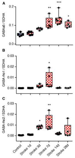 Temporal changes in α5, ρ1, and ρ2-subunit expression were assessed in the peri-infarct region using real time qPCR after photothrombotic stroke to the motor cortex. (A) GABAA α5 expression, (B) GABAC ρ1 expression, and (C) GABAC ρ2 expression was assessed in stroke (red) and sham (blue) animals. * p < 0.05, ** p < 0.01, *** p < 0.001 (n = 5 for sham and 1, 3, 7, 14 and 28-days post-stroke). Data expressed as box plot (boxes, 25–75%; whiskers, minimum and maximum; lines, median). GABA: γ-aminobutyric acid.