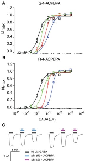 Whole-cell currents were recorded using the two-electrode voltage clamp technique. To determine the GABA inhibitory activity of (S)-4-ACPBPA and (R)-4-ACPBPA on ρ2 receptors, inhibitory concentration response curves of (S)-4-ACPBPA and (R)-4-ACPBPA were co-applied with GABA 1 µM (≈EC50) with oocytes clamped at −60 mV. Data were acquired with a LabChart v 3.5.2 (ADInstruments Pty Ltd, New South Wales, Australia) analogue to digital converter, and currents low-pass-filtered at 1 kHz and sampled at 3 kHz were measured offline with LabChart v3.5.2 software. The bath solution contained ND96 solution, and electrodes were filled with 3M KCl (0.5–2 MΩ). Solutions were bath applied using a gravity-fed perfusion system.
