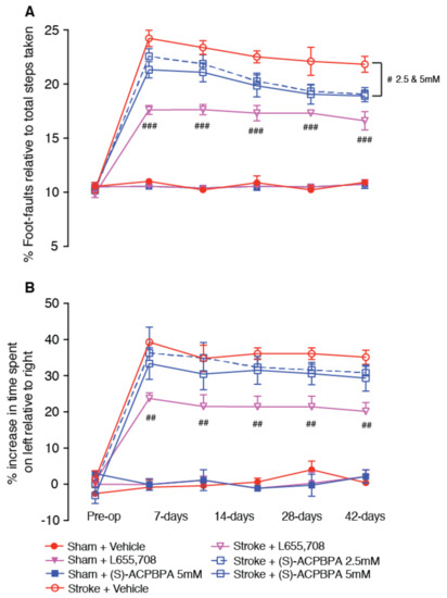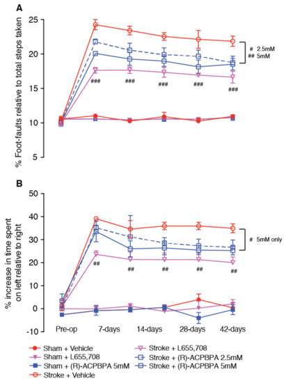 Assessment of functional recovery following delayed chronic treatment with either L655,708 or (R)-4-ACPBPA revealed a significant treatment effect on both the grid-walking and cylinder tasks. Post-hoc analysis revealed that treatment with 2.5 mM (R)-4-ACPBPA showed an improvement in motor function on days 7, 14, 21, 28, and 42 post-stroke (17% and 39% on day 7 and 42 post-stroke, respectively), whilst treatment with 5 mM (R)-4-ACPBPA showed a marked improvement in function from day 7 after stroke (29% and 43% on day 7 and 42 post-stroke, respectively), with the level of improvement not being different than the improvement following L655,708 treatment (53% 42-days post-stroke). In addition, treatment with 5 mM (R)-4-ACPBPA also showed an improvement in motor function as assessed in the cylinder task on days 21 (33% improvement), 28 (36% improvement), and 42 (37% improvement) post-stroke (Figure 3B).