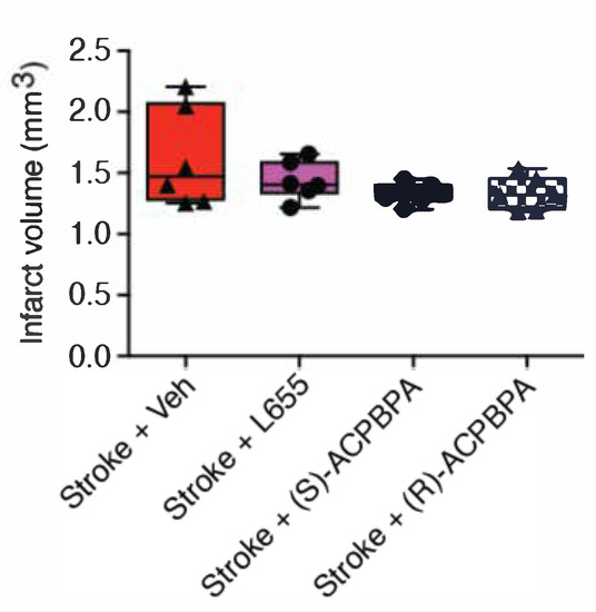 For the qPCR experiment, a total of 30 animals, 5 for each time point (0, 1, 3, 7, 14, and 28 days post-stroke) were used. For behavioral assessments, a total of 100 animals were divided into 10 different groups of 10 animals: (1) Sham + Vehicle, (2) Sham + L655,708, (3) Sham + 5 mM (S)-4-ACPBPA, (4) Sham + 5 mM (R)-4-ACPBPA, (5) Stroke + Vehicle, (6) Stroke + L655,708, (7) Stroke + 2.5 mM (S)-4-ACPBPA, (8) Stroke + 5 mM (S)-4-ACPBPA, (9) Stroke + 2.5 mM (R)-4-ACPBPA, (10) Stroke + 5 mM (R)-4-ACPBPA. Of these animals, six from each group were randomly selected to determine infarct size, GAT3, and GFAP analysis. For the combinatorial studies, a total of 48 animals were divided into 6 different groups of 8 animals: (1) Sham + Vehicle, (2) Sham + 5 mM L655,708 + 5 mM (R)-4-ACPBPA, (3) Stroke + Vehicle, (4) Stroke + L655,708, (5) Stroke + 5 mM (R)-4-ACPBPA, (6) Stroke + 5 mM L655,708 + 5 mM (R)-4-ACPBPA.