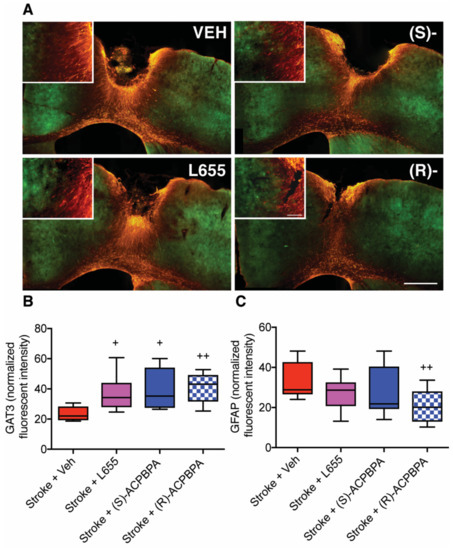 Changes in GABA transporter type 3 (GAT3) and glial fibrillary acidic protein (GFAP) expression were assessed 42 days post-stroke. (A) Representative photomicrographs showing GAT3 (green) and GFAP (red) labeling from stroke + vehicle (VEH), Stroke + L655,708 (L655), stroke + S-4-ACPBPA (S-), and stroke + (R)-4-ACPBPA (R-) High magnification images of each of the treatment groups from right next to the stroke border. Normalized fluorescent intensity measurements for GAT3 (B) and GFAP (C) were obtained from peri-infarct regions 400 µm from the stroke border. + p < 0.05, ++ p < 0.01. Data expressed as box plot (boxes, 25–75%; whiskers, minimum and maximum; lines, median) for an n = 6/treatment group. The scale bar in the insert = 100 um, whereas the scale bar shown in the main photomicrograph = 400 um.