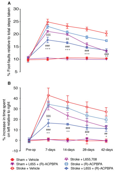 Behavioral recovery was assessed pre-op (before) and 7, 14, 21, 28, and 42 days after a photothrombotic stroke in the presence of the GABAA α5 NAM, 5 mM L655,708, the GABAC ρ2 antagonist, 5 mM (R)-4-ACPBPA, or a combined 5 mM L655,708 and 5 mM (R)-4-ACPBPA. Motor function was assessed by analyses of (A) foot-faults and (B) forelimb asymmetry in the grid-walking and cylinder tasks, respectively. ## p < 0.01, ### p < 0.001, compared to stroke + vehicle; + p < 0.05, ++ p < 0.01, +++ p < 0.001, compared to sham + L655,708 + (R)-4-ACPBPA; $$ p < 0.01, $$$ p < 0.001, compared to stroke + L655,708. Data are expressed as mean ± SD for n = 8 / treatment group.