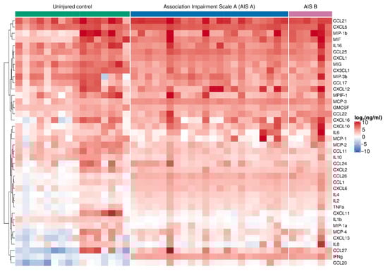 Graphical representation showing log2 cytokine concentrations (color keys), generated with the multiplex analysis of the blood serum collected at 2 weeks post-injury (n = 28) or from uninjured controls (n = 16). A dendrogram resulting from hierarchical clustering of cytokines is shown on the left.