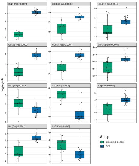 We performed simultaneous multiple cytokine analysis of the blood serum on 2 weeks post-SCI patients and uninjured subject samples (Supplementary Table S1, Figure 1). IFNγ, CCL27, CCL26, CXCL6, IL2, IL4, MCP-3, and MIP-3a all showed a significant elevation in the SCI patient samples (Figure 2). The greatest difference was found for IFNγ, which was more than ~52 times higher (FC 52.04 (39.68; 68.25), Padj = 0.0001) in SCI patients compared to the uninjured control subjects. Large differences were also seen for CCL27 (13.10 (2.87; 59.90), Padj = 0.0044) and CCL26 (8.12 (5.79; 11.39), Padj = 0.0001) levels, which were both elevated 2 weeks after SCI.