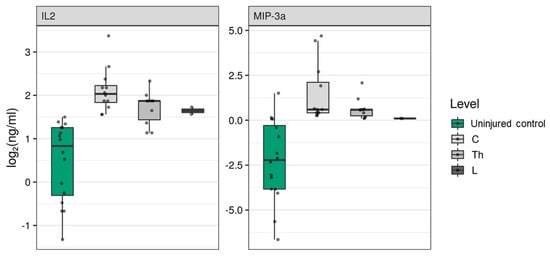 Log2-transformed blood serum cytokine concentrations (ng/mL) between patients at 2 weeks post-spinal cord injury (gray columns, n = 28), considering the cohort of cervical (C, n = 13), thoracic (Th, n = 12), and lumbar (L, n = 3) patients, and uninjured control subjects (green columns, n = 16).