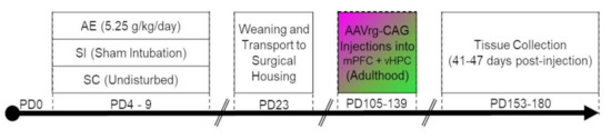 All procedures performed in this experiment were carried out in accordance with the animal use protocol #1134 approved by University of Delaware (UD) Institutional Animal Care and Use Committee (IACUC), and in accordance with NIH’s Animal Care Guidelines. This study uses a well-characterized rodent model of third trimester-equivalent binge-like AE [21,23,24,25,26,27] to determine the impact of developmental AE on the connectivity of prefrontal-thalamo-hippocampal circuitry (vCA1-Re-mPFC circuit, in particular). A timeline depicting experimental procedures following birth can be found in Figure 1.