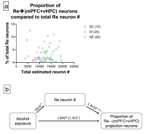 Figure 5. Neuron loss did not mediate the AE-induced increase in proportion of Re neurons that concurrently innervate mPFC and vHPC. (a) Scatterplot showing the relationship between total neuron number in Re and proportion of Re→(mPFC + vHPC) projection neurons; (b) Schematic representation of the mediation analysis between AE, Re neuron number, and proportion of Re→(mPFC + vHPC) projection neurons. The total effect of AE (in % of neurons) is shown in parentheses, while the direct effect is listed immediately next to the total effect (also in % of neurons). While the relationship between AE and Re neuron number was significant (estimate given in number of neurons), there was no significant association between Re neuron number and proportion of Re→(mPFC + vHPC) projection neurons, resulting in a lack of mediating effect. Data include both male and female animals, which are not differentiated due to the lack of sex effects. Sample sizes are given in parentheses next to each treatment group in the panel (a) legend. * p ≤ 0.050, ** p ≤ 0.010, n.s. = not statistically significant. For exact statistical values, see Section 3.3.