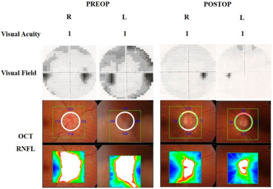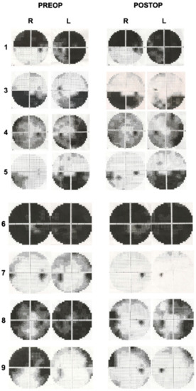 Preoperative and postoperative visual field examinations of patients.