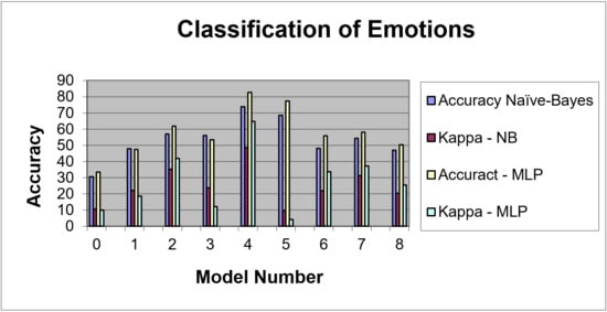 The naive Bayes approach together with MLP provided low accuracy and Kappa values. Increasing the amount of weights and training time, from 0.3 to 0.5 and 500 to 1000, respectively, did not improve the overall accuracy of classifying the series of attributes and emotions.