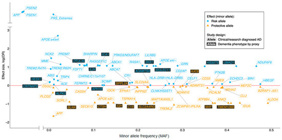 Over the past three decades great advances in gene discovery have been made by worldwide collaborative projects such as European AD DNA Biobank (EADB), AD Sequencing Project (ADSP), AD European Sequencing Consortium (ADES) and the International Genomics of Alzheimer’s Project (IGAP). These pioneering studies are summarized elsewhere [7]. To date around 70 genetic variants have been reported to be associated with AD risk (Figure 1) and these discoveries have indicated the involvement of pathways, additional to APP metabolism, such as immunity, ubiquitination, endocytosis, lipid metabolism and tau binding [8,9]. Furthermore, generation of large databases of genetic data have led to discoveries of genetic prediction strategies such as the polygenic risk score for AD [10].