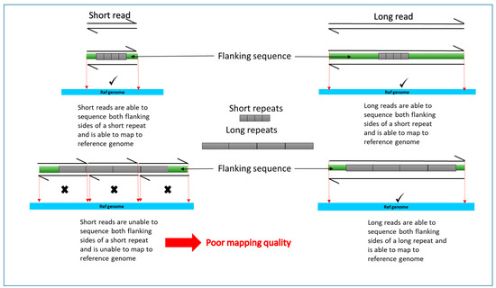 A simplified, schematic diagram comparing short read and long read mapping to reference genome for long and short repeats. Sequencing reads are indicated by partial arrows. Grey rectangles represent target sequence. Flanking sequence is represented by green rectangles. Reference genome used to align the reads is indicated in blue. Reads poorly or not aligned to the reference genome are indicated by X. Success in mapping to reference genome indicated by a tick.