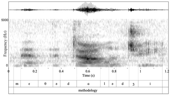 Waveform and spectrogram of the word methodology/ˌmɛθəˈdɑləʤi/uttered by a female patient with nfvPPA/AOS. The middle tier shows with thick vertical lines the boundaries of vowels and consonants and the lower shows the target word.
