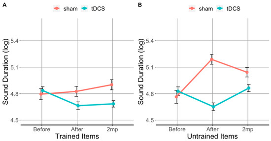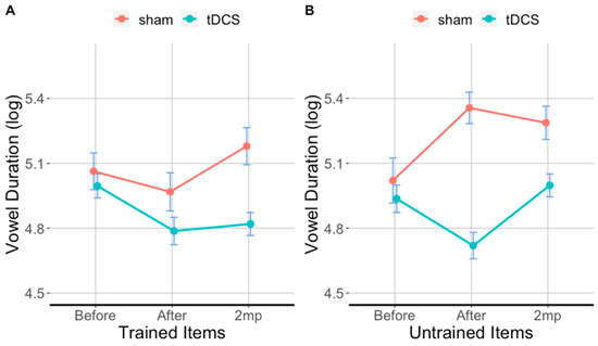Trained items (A) and untrained items (B) evaluated before (before), immediately after (after), and 2 months post-treatment (2 mp) for each condition. The ordinate shows vowel duration (log transformed), error bars show 95% CI; lower values: shorter segments/faster production. Turquoise lines show tDCS effects; red lines show sham effects.