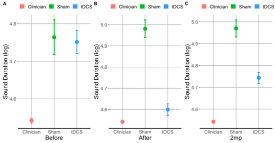 Sound (vowels and consonant) duration (trained and untrained) (log transformed) produced by clinicians and patients that received tDCS and sham evaluated before (A), after (B), and 2 months post-treatment (C). Error bars show 95% CI; lower values: shorter segments/faster production.