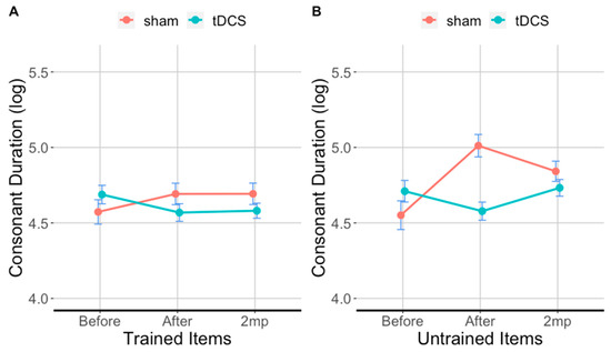 Trained items (A) and untrained items (B) evaluated before (before), immediately after (after), and 2 months post-treatment (2 mp) for each condition. The ordinate shows consonant duration (log transformed), error bars show 95% CI; lower values: shorter segments/faster production. Turquoise lines show tDCS effects; red lines show sham effects.