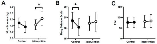 Comparison of muscle mass (A), Berg Balance Scale (BBS) score (B), and FIM score (C) pre- and postintervention in the two groups. * p < 0.05. Data shown means ± standard error of the mean.