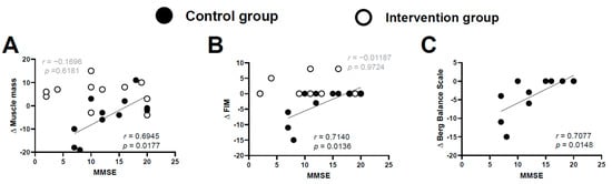 Correlations between the MMSE score and Δmuscle mass (A), ΔFIM (B), and ΔBBS score (C). Strong correlations were observed between the MMSE score and Δmuscle mass, ΔFIM score, and ΔBBS score in the control group (Bonferroni correction; critical alpha < 0.05/2 = 0.025). Data from the intervention group are not shown in Figure C because none of the individuals in this group had a decreased BBS score.